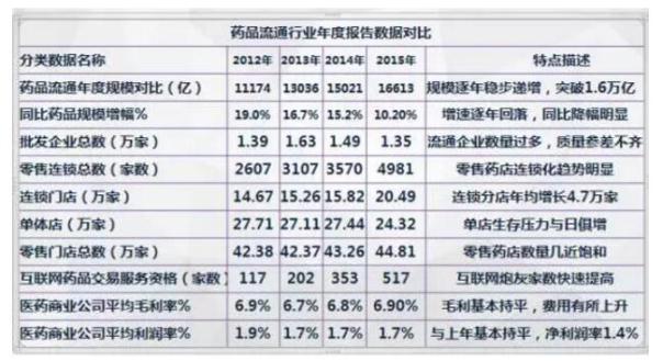 2012-2015年,医药流通行业数据对比分析,请看下图: