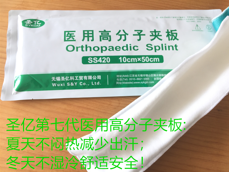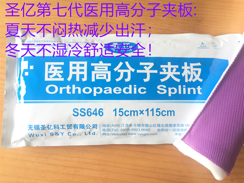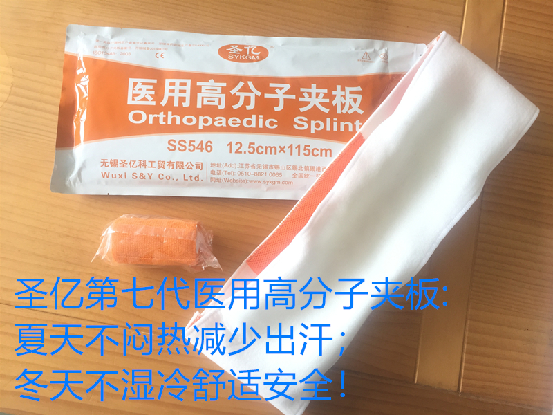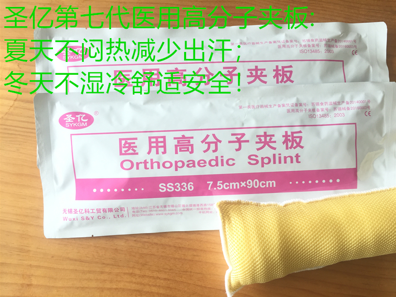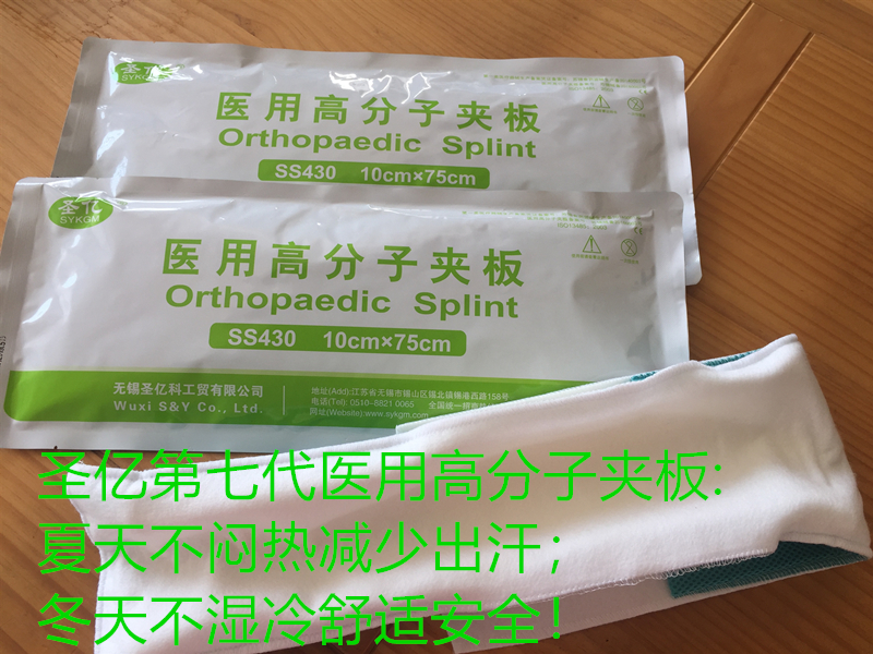 圣亿第七代医用高分子夹板,形式新颖,使用方便,免除了隐患。避免了像其他夹板的漏胶渗入无纺布衬垫、固化后凝成胶刺,会扎伤患者的事故发生。